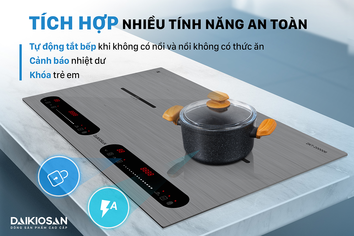 Bếp điện từ đôi Daikiosan DKT-200006 đặc biệt được yêu thích bởi nhiều gia đình có trẻ em vì có tính năng khóa an toàn cho trẻ em. Cụ thể khi khởi động chức năng này thì bảng điều khiển cảm ứng sẽ bị vô hiệu hóa, nên không gây nguy hiểm hoặc không bị thay đổi chương trình nấu khi trẻ vô tình chạm vào bếp.
