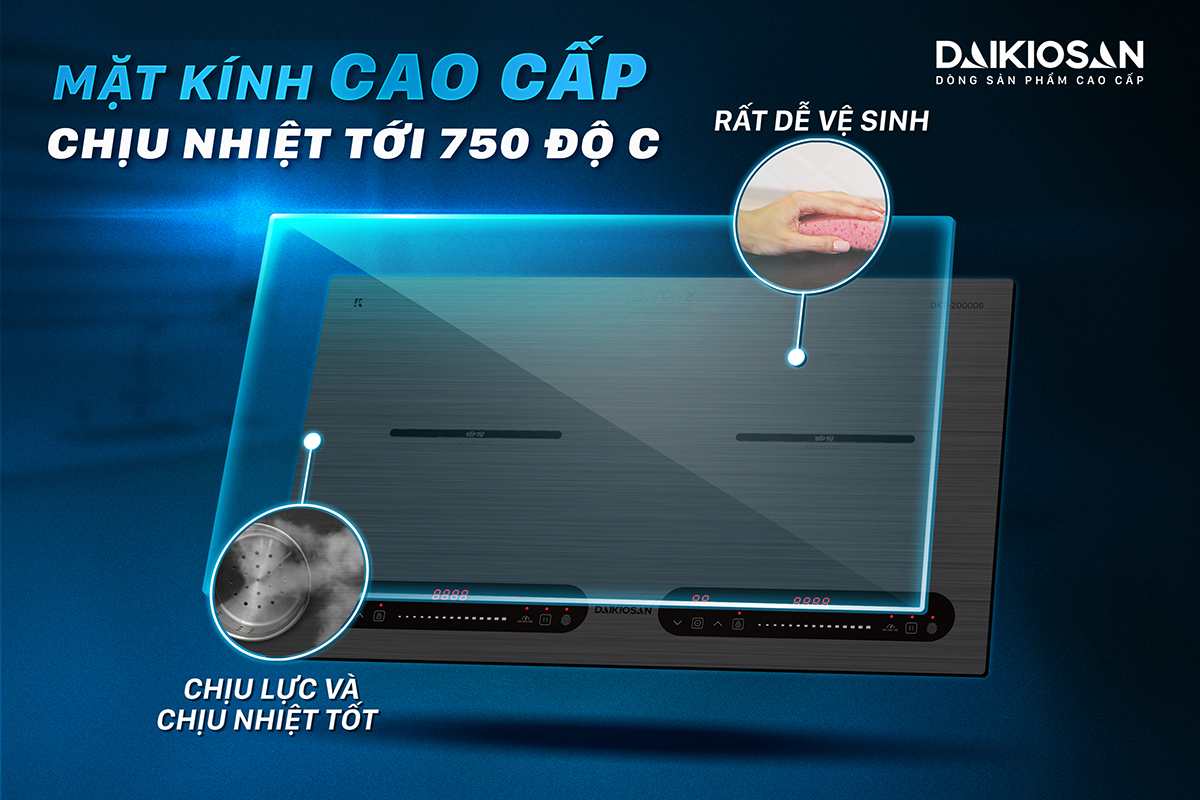 Bếp từ đôi Daikiosan DKT-200006 sử dụng loại mặt kính chịu nhiệt cao cấp với nhiều ưu điểm nổi bật như: