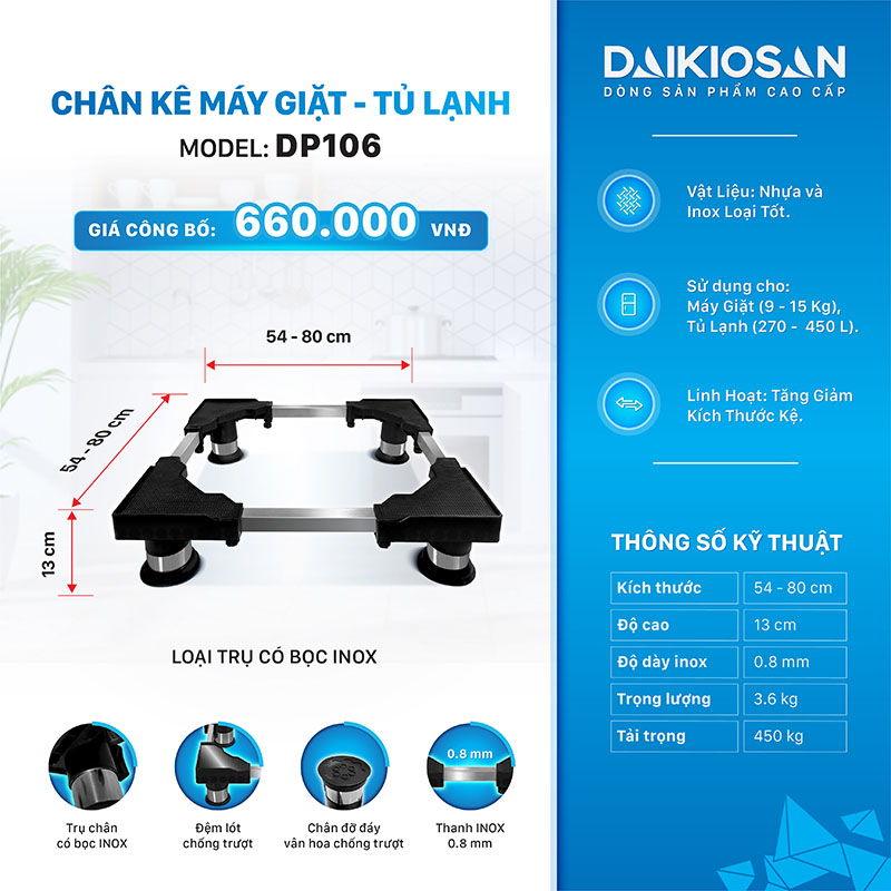 Chân kê máy giặt, tủ lạnh trụ bọc Inox Daikiosan DP106