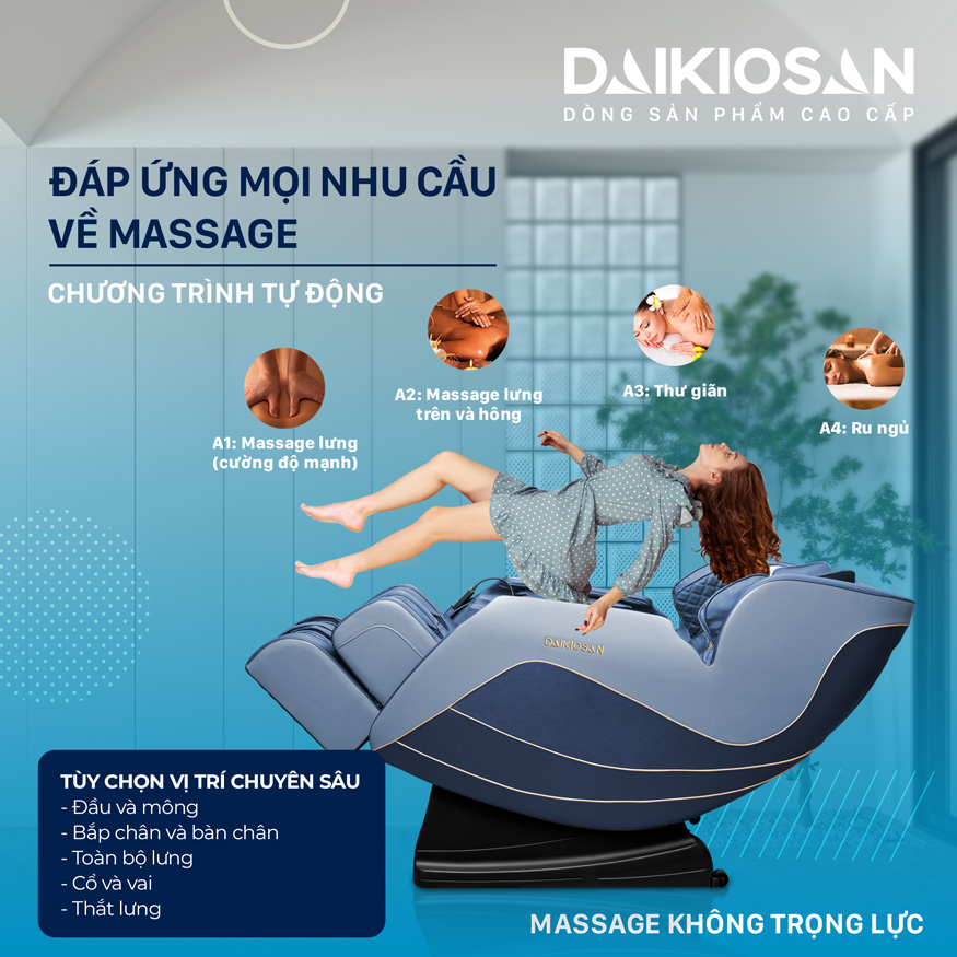 Daikiosan DKGM-00005 ứng dụng công nghệ massage đỉnh cao giữa hệ thống tới 26 con lăn 2D được xoay cố định ở nhiều vị trí trên cơ thể và kết hợp với công nghệ rung massage ở phần mông giúp người dùng sẽ tận hưởng những chương trình massage vô cùng đặc biệt, xua tan mệt mỏi, giảm đau nhức hiệu quả.