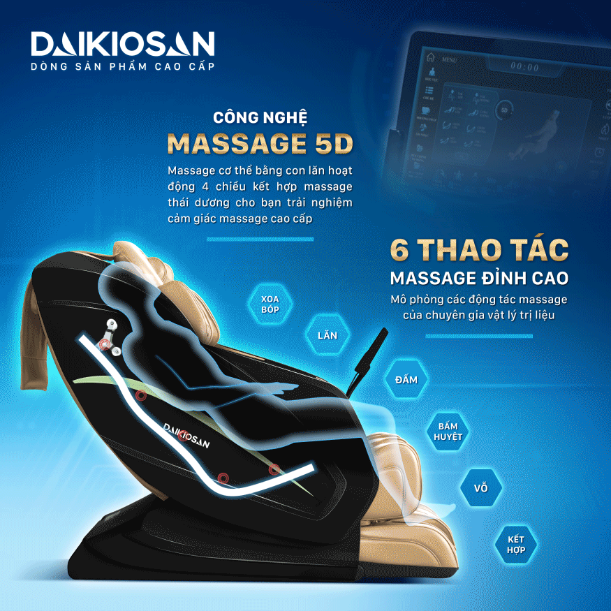 | Động tác massage | Có 6 động tác massage mô phỏng động tác của các chuyên gia vật lý trị liệu: Xoa bóp, lăn, đấm, bấm huyệt, vỗ, kết hợp. |