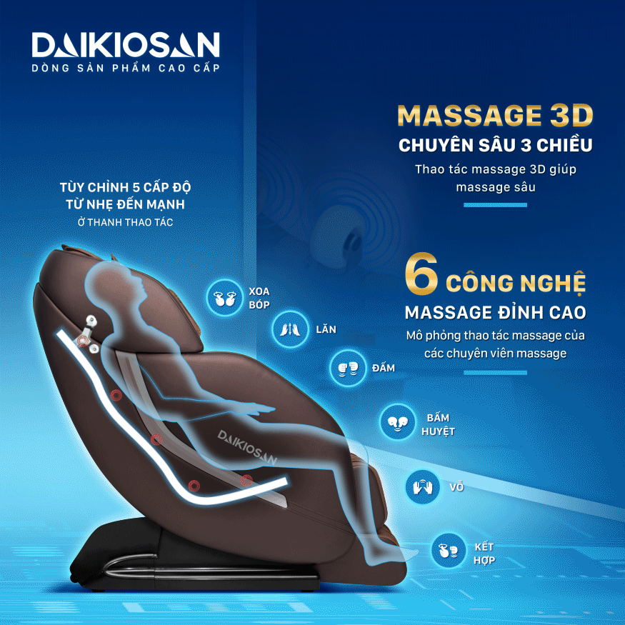 Ghế massage toàn thân Daikiosan DVGM-10002 sử dụng công nghệ AI, massage 3D kết hợp trị liệu Đông Y rất hoàn hảo để chăm sóc sức khỏe, báo hiếu với người lớn tuổi để giảm stress, đau nhức, mang đến niềm vui cho cả nhà.