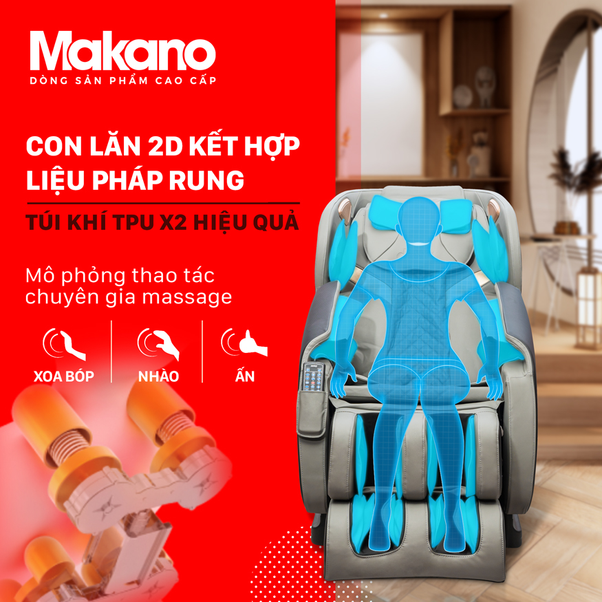 Ghế massage Makano MKGM-00005 có tới 3 thao tác massage mô phỏng bàn tay massage của các chuyên gia massage: Xoa bóp, nhào, ấn. Các thao tác massage này được tạo ra nhờ sự kết hợp hệ thống 26 con lăn 2D và 22 túi khí TPU cao cấp được bố trí thông minh khắp cơ thể, đặc biệt ở phần mông còn có hệ thống massage bằng công nghệ rung hiện đại.