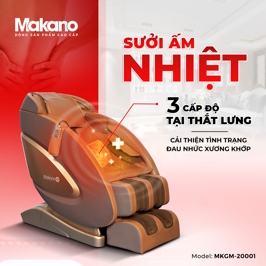Các cơn đau thắt lưng do vận động hay ngồi sai tư thế thường dai dẳng, rất khó chịu. Vì vậy ghế massage Makano MKGM-20001 cài đặt thêm chức năng massage nhiệt carbon với tùy chỉnh 3 mức độ tại thắt lưng. Chức năng này giống như massage đá nóng, xông khô tại các spa giúp sưởi ấm, hỗ trợ lưu thông máu, hỗ trợ giảm các cơn đau thắt lưng hiệu quả.