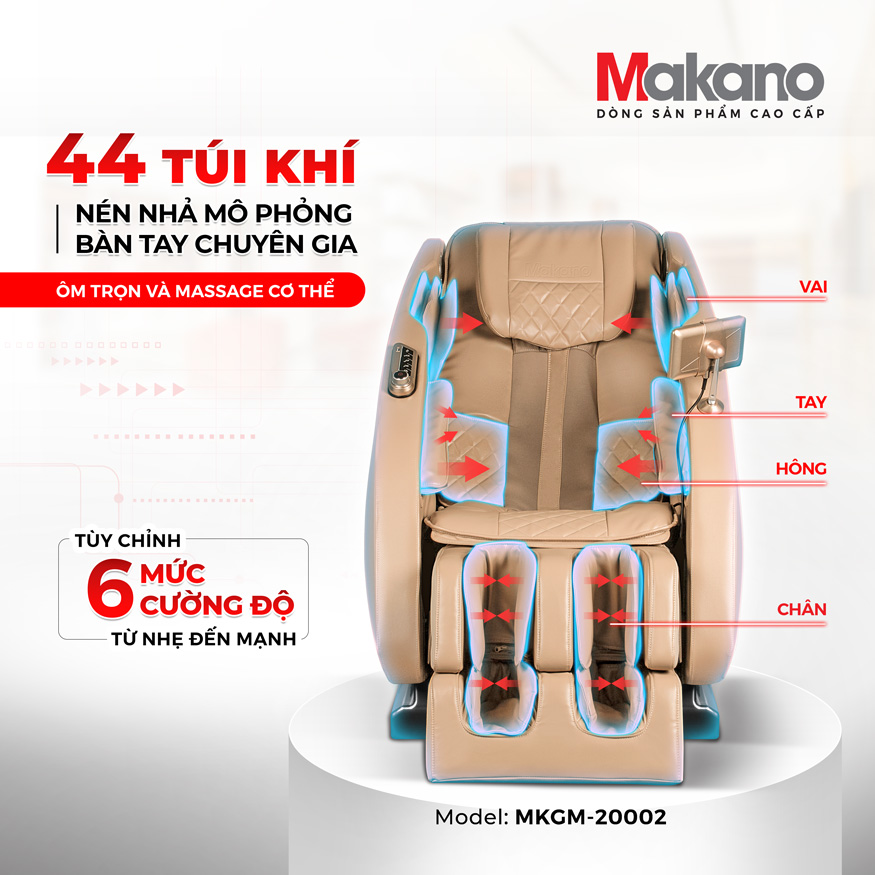 Ghế massage Makano MKGM-20002 được trang bị 44 túi khí có thể tùy chỉnh theo 6 cấp độ từ mạnh đến nhẹ.