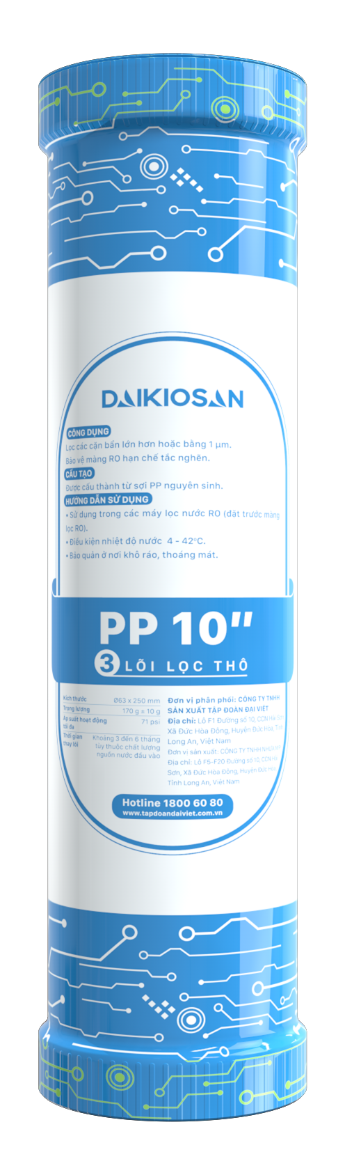 Lõi lọc PP 10'' 1 micron Daikiosan thuộc bộ lõi lọc thô, được đặt vị trí: trước màng RO.