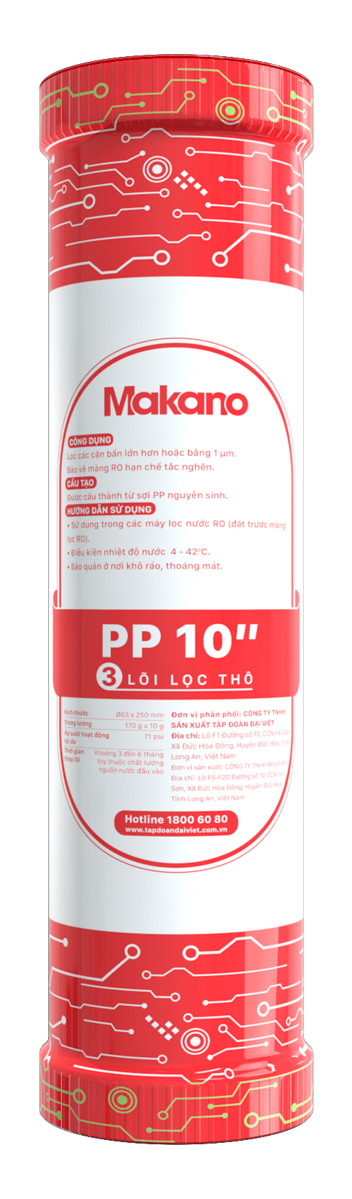Lõi lọc PP 10'' 1 micron Makano thuộc bộ lõi lọc thô, được đặt vị trí: trước màng RO.