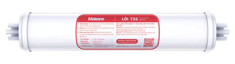 Hiện Lõi T33 than hoạt tính gáo dừa Makano được phân phối bởi HUKAKI VIETNAM có phân phối sản phẩm máy lọc nước RO Makano tại hệ thống đại lý, chuỗi siêu thị khắp toàn quốc....