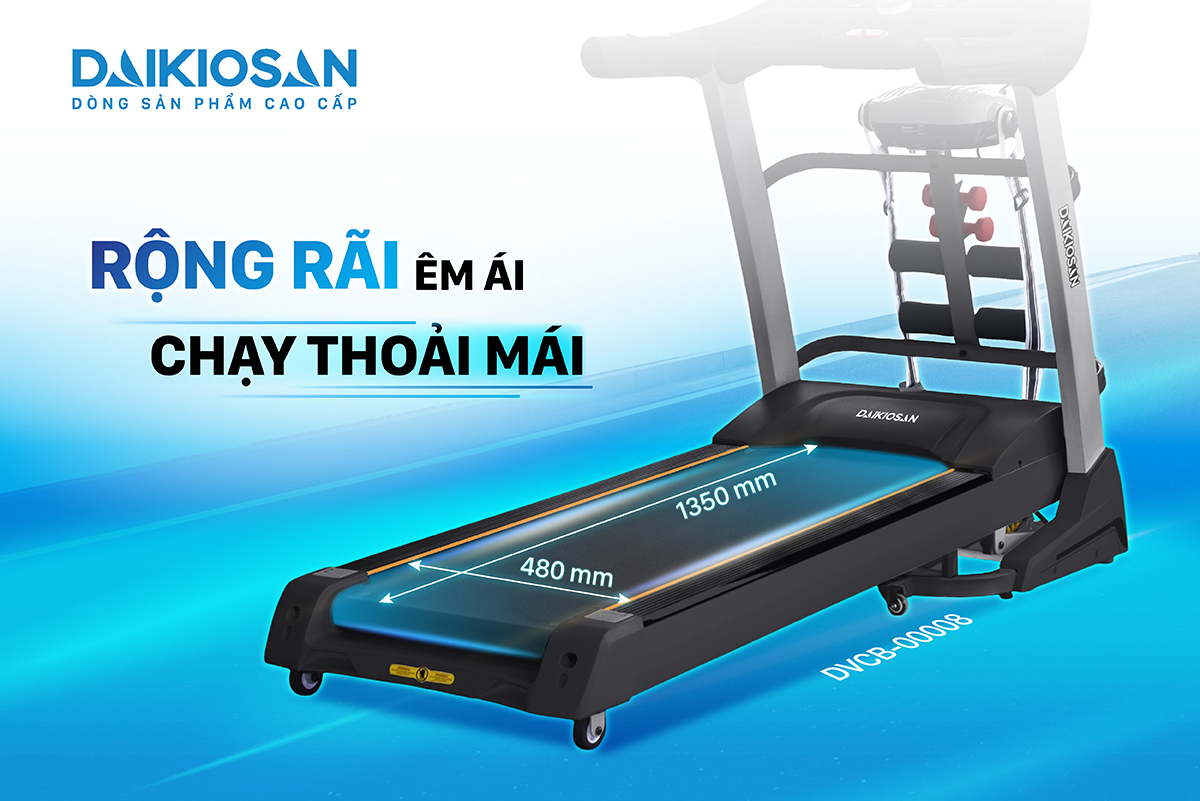 Máy chạy bộ đa năng Daikiosan DVCB-00008 còn có kích thước phần thảm chạy rộng và dài tới 1350*480 mm giúp bạn chạy bộ sải bước thoải mái dù tập luyện ở vận tốc cao.