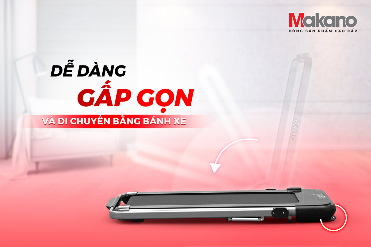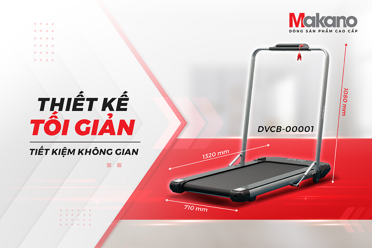 Máy chạy bộ đơn năng Makano DVDB-00001 được thiết kế theo phong cách tối giản với tone màu đen, viền xám sang trọng, cho phép xếp gọn để tối ưu không gian và dễ dàng di chuyển bằng bánh xe khi cần thiết.