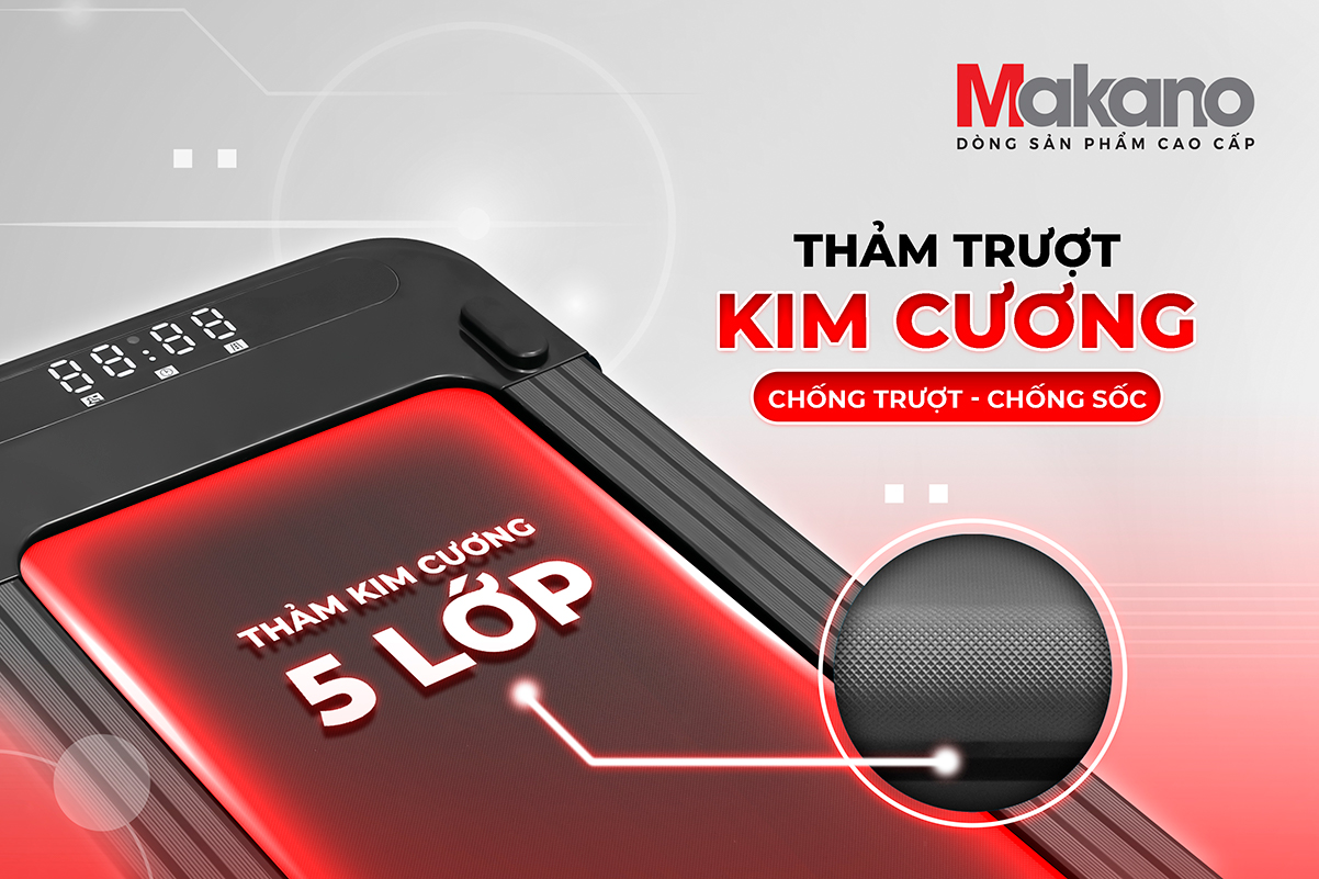 Thảm chạy có bề mặt kết cấu kim cương giúp tăng ma sát, chống trượt và chống sốc hiệu quả, để bạn luôn bám chắc chân trên thảm.