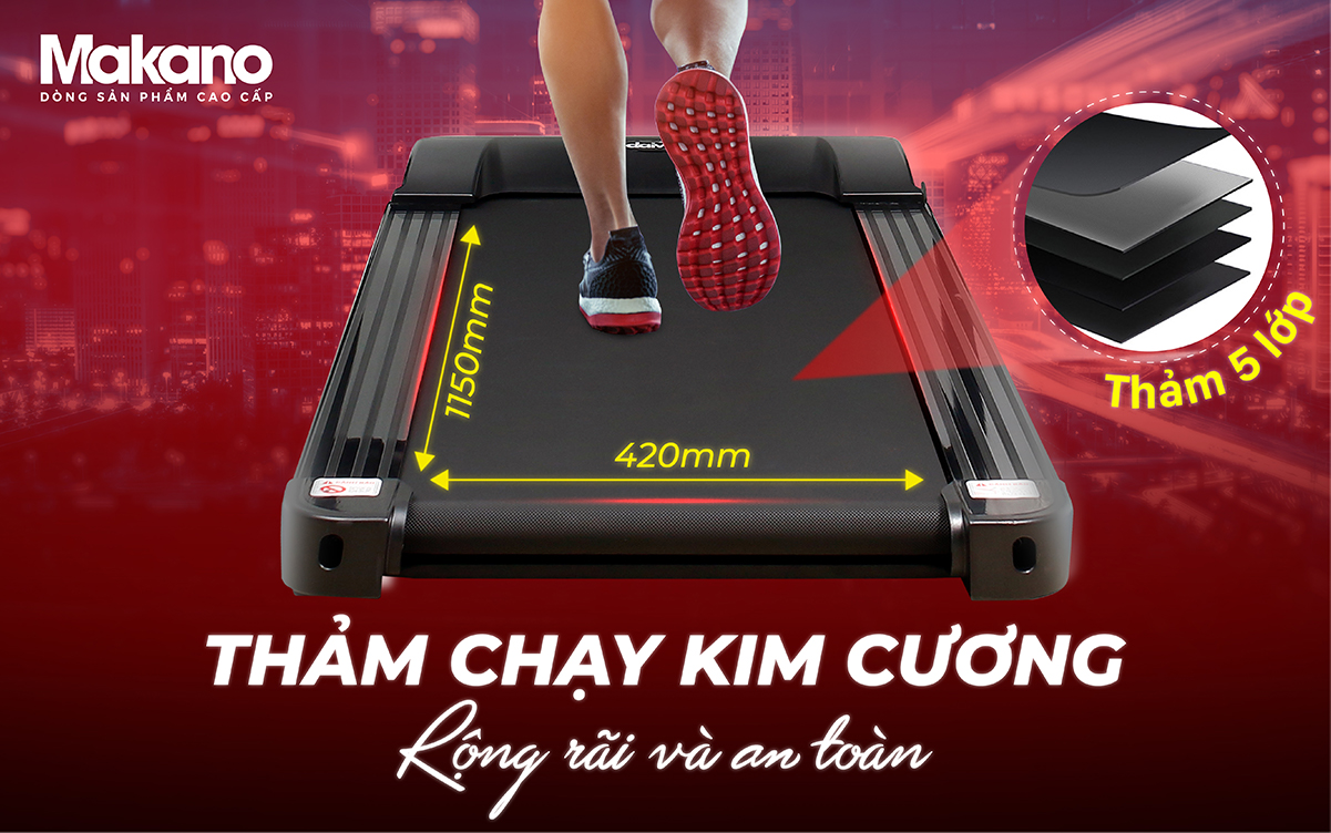 Ngoài ra, máy chạy bộ đa năng Makano DVCB-00002 còn sở hữu thảm chạy kim cương chống trượt, chống sốc với diện tích lớn đến 1150*420mm, cho bạn sải bước chạy thoải mái và an tâm khi tập luyện.