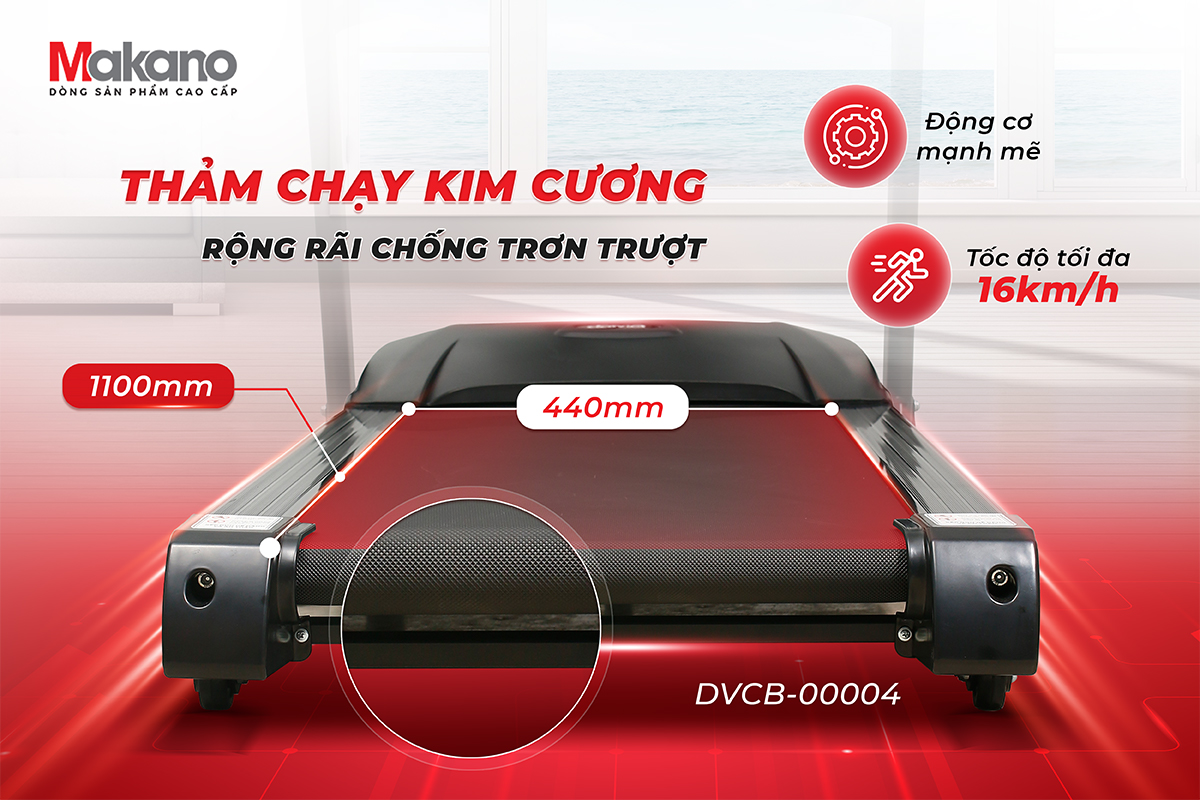 Thảm chạy của máy chạy bộ đa năng Makano DVCB-00004 là thảm kim cương được cấu tạo nhiều lớp siêu bền. Ưu điểm nữa là vô cùng êm ái, chống sốc, chống trượt hiệu quả.