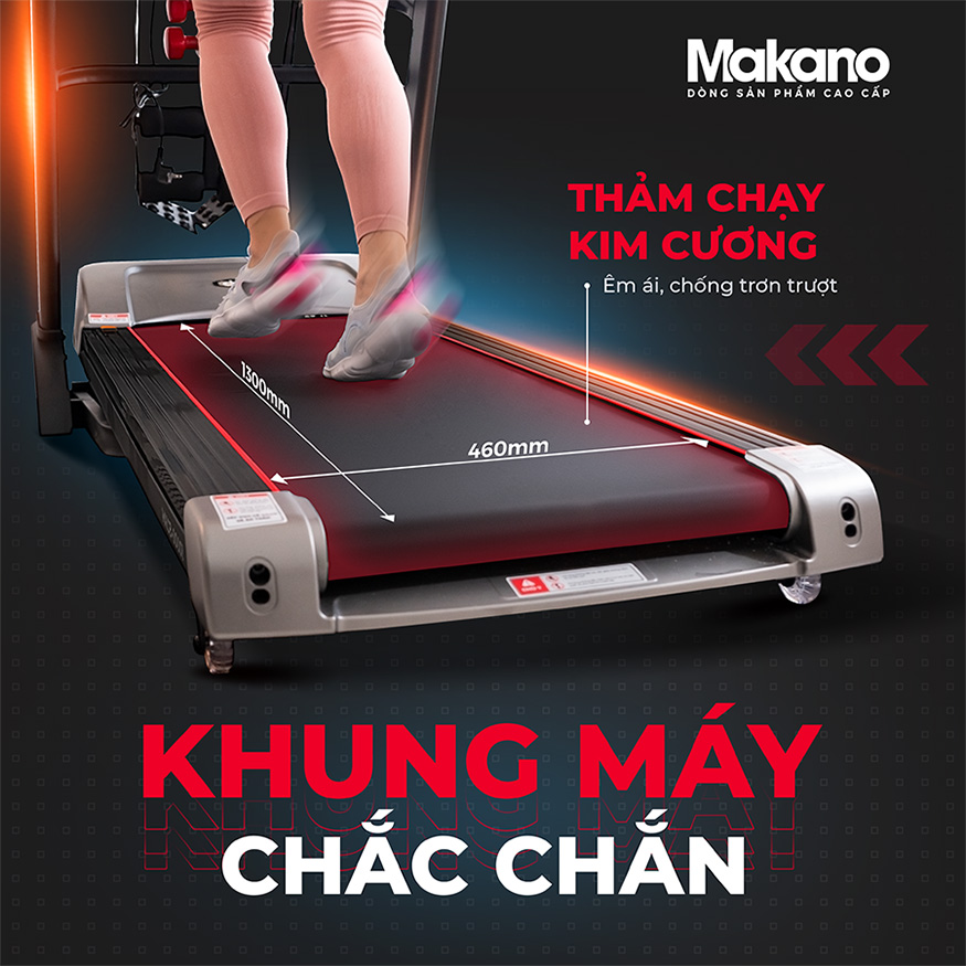 Máy chạy bộ Makano MKCB-00001 có kết cấu thảm chạy kim cương với kích thước vô cùng rộng tới 1300x460mm, kết hợp hệ thống giảm xóc bằng cao su nên giúp bước chạy thoải mái, nhẹ nhàng dù chạy ở cường độ cao.