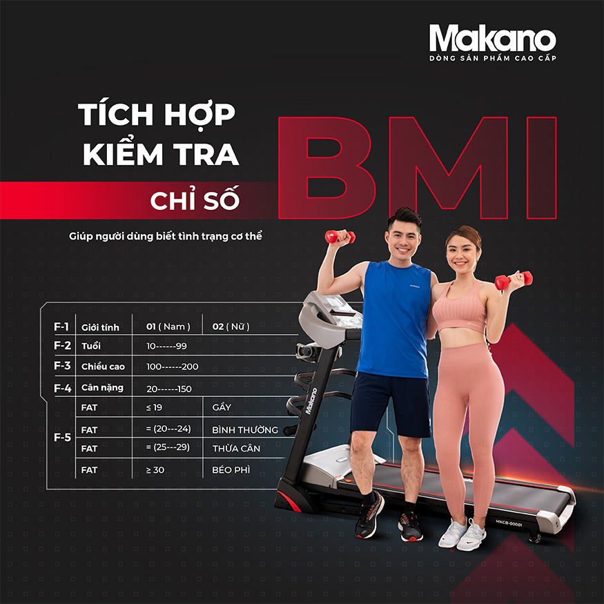 Sở hữu máy chạy bộ Makano MKCB-00001 bạn dễ dàng đo được chỉ số BMI chỉ với những thao tác cực dễ dàng được hướng dẫn trong sổ tay hướng dẫn sử dụng đi kèm với máy chạy bộ khi mua hoặc tìm video hướng dẫn sử dụng máy chạy bộ này trên kênh youtube chính thức của Makano.