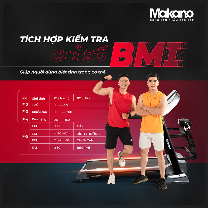 Sở hữu máy chạy bộ Makano MKCB-00002 bạn dễ dàng đo được chỉ số BMI chỉ với những thao tác cực dễ dàng được hướng dẫn trong sổ tay hướng dẫn sử dụng đi kèm với máy chạy bộ khi mua hoặc tìm video hướng dẫn sử dụng máy chạy bộ này trên kênh youtube chính thức của Makano.