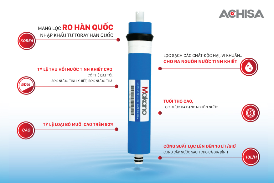 Màng RO Makano Korea: hay còn gọi là lõi lọc tinh được nhập khẩu từ Hàn Quốc hoạt động bằng cơ chế lọc thẩm thấu ngược với khe hở rất nhỏ có kích thước khoảng 0.1-0.5 nanomet nên lọc đến 99.9% vi khuẩn, virus, cặn bẩn, các chất rắn, kim loại nặng... cho ra nguồn nước tinh khiết.