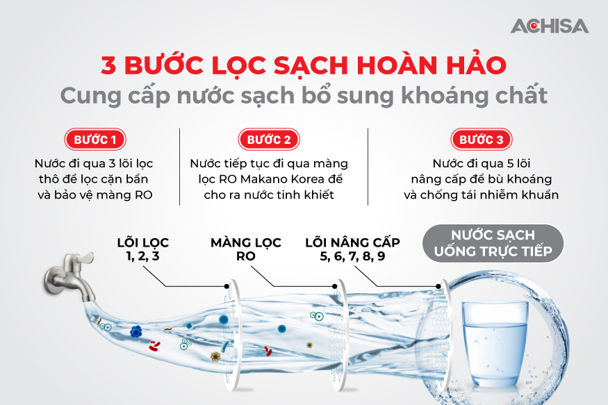 Máy lọc nước RO nóng nguội lạnh Achisa ACW-32709H sở hữu hệ thống 9 cấp lọc gồm 3 phần chính: lõi lọc thô, màng RO và lõi lọc tinh.