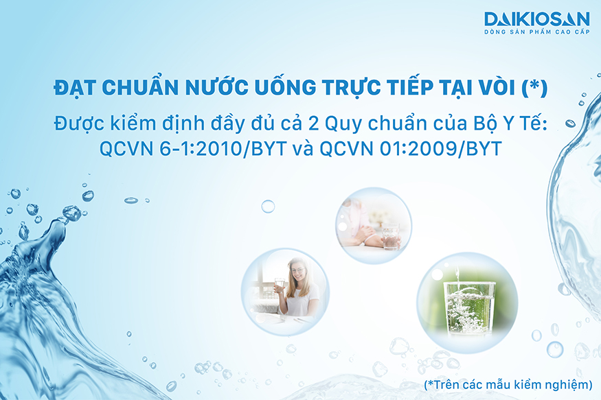 Máy lọc nước RO nóng nguội lạnh Daikiosan DSW-33710H được kiểm định trên từng lô sản phẩm. Viện Y tế Công cộng TP.HCM sẽ kiểm định chất lượng sản phẩm đảm bảo nguồn nước đạt chuẩn nước uống trực tiếp, không cần đun sôi theo quy chuẩn cao nhất hiện nay: QCVN06-1:2010/BYT thì mới được xuất bán trên thị trường nên bạn hoàn toàn yên tâm khi sử dụng sản phẩm.