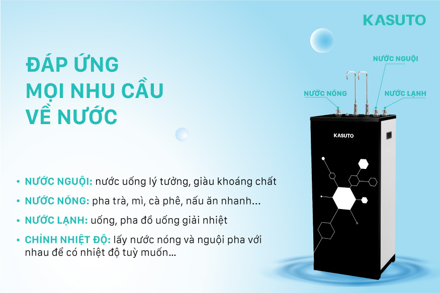 Máy lọc nước RO nóng nguội lạnh Kasuto KSW-32809H với 3 chế độ nước nóng - nguội - lạnh siêu tiện lợi, cung cấp nguồn nước sạch uống trực tiếp ngay tại vòi mà không cần đun sôi.