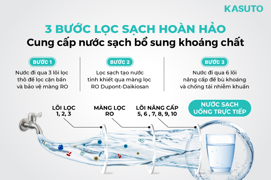 Máy lọc nước RO nóng nguội lạnh Kasuto KSW-32709H sử dụng màng lọc RO Daikiosan Dupont cho ra dòng nước sau lọc đạt độ tinh khiết cao.