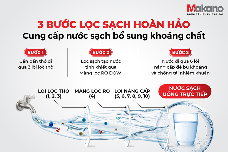 Máy lọc nước RO nóng nguội lạnh Makano MKW-33710H sử dụng công nghệ lọc nước RO tiên tiến bậc nhất với 10 lõi cho nguồn nước sạch và đầy đủ khoáng chất. Nguồn nước sẽ lọc qua 3 bước với 10 lõi như sau: