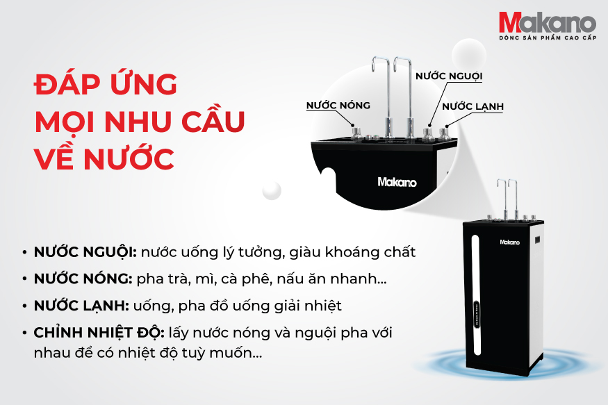 Máy lọc nước RO nóng nguội lạnh Makano MKW-42710H3 đáp ứng nhu cầu sử dụng khi tích hợp 3 loại nước nóng - nguội - lạnh với 2 vòi tiện dụng, cung cấp nguồn nước sạch đạt chuẩn cho cả gia đình.