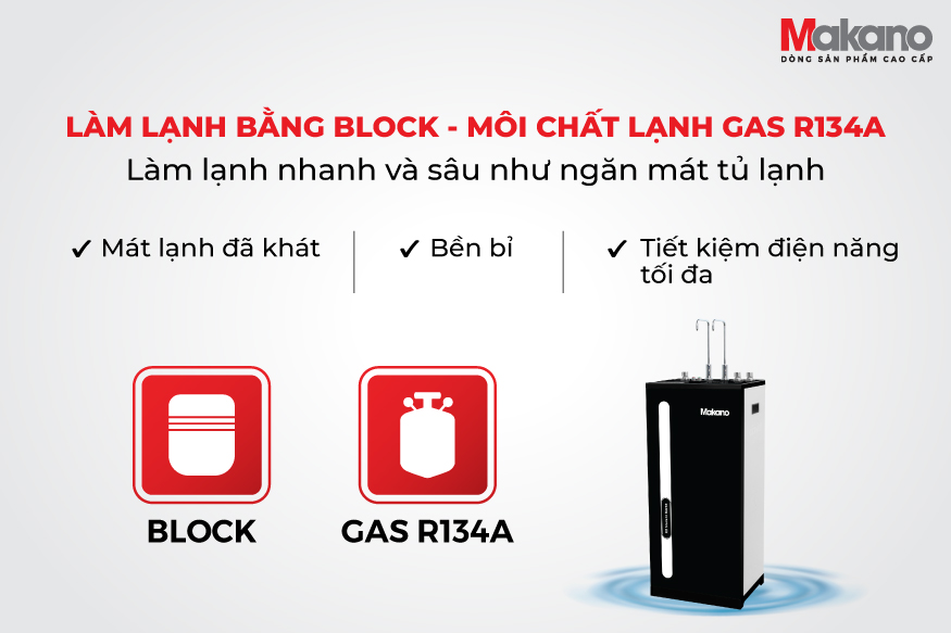 Máy lọc nước nóng nguội lạnh Makano sử dụng công nghệ làm lạnh bằng Block rất bền bỉ, lạnh sâu hơn như nước bỏ trong tủ lạnh... nên bạn hoàn toàn yên tâm về chất lượng sản phẩm.