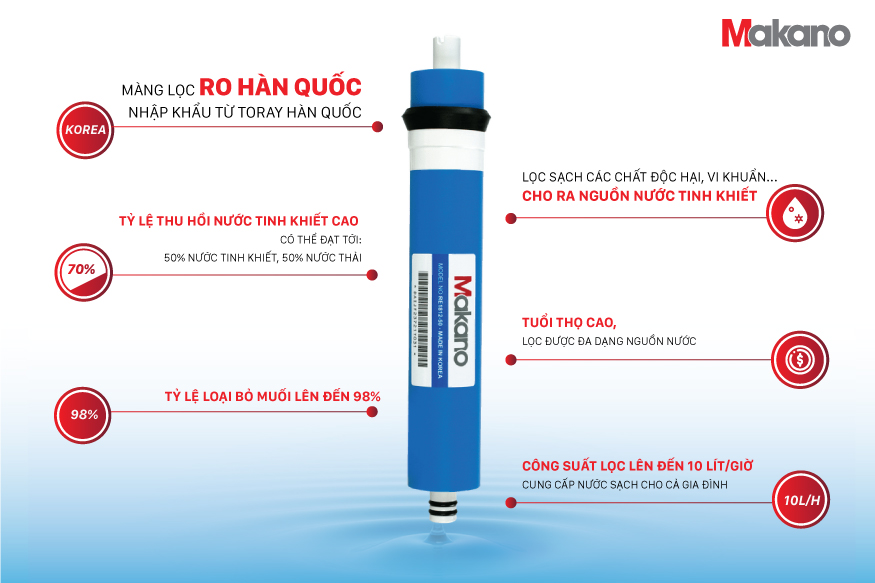 Máy lọc nước RO nóng nguội lạnh Makano MKW-42810H3 sử dụng màng lọc RO nhập khẩu từ Hàn Quốc. Nhờ công nghệ lọc thẩm thấu ngược nên lọc sạch mọi vi khuẩn, chất gây hại còn trong nước để cho ra nguồn nước tinh khiết.