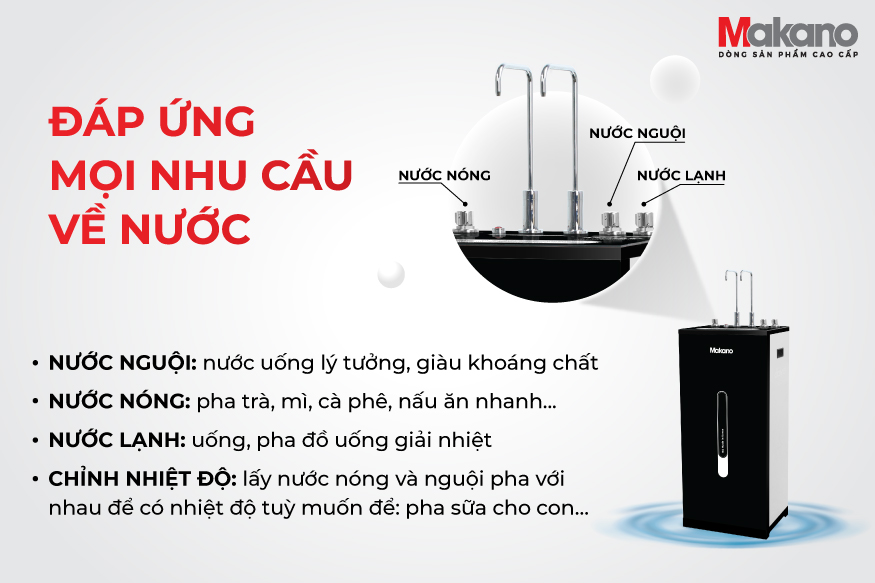 Thay vì chỉ sử dụng máy lọc nước với 1 chế độ nước thường, bạn có thể sử dụng máy lọc nước RO nóng nguội lạnh Makano MKW-42810H3 với 3 chế độ nước: nóng - nguội - lạnh cho nhiều nhu cầu sử dụng khác nhau.