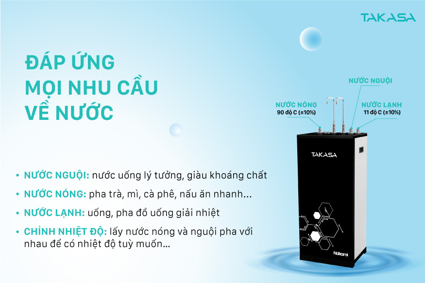 Sử dụng máy lọc nước RO nóng nguội lạnh Takasa TAW-43710H với 3 chế độ nước: nóng - nguội - lạnh bạn sẽ không còn tốn công sức để nấu nước sôi, không cần phải làm mát nước bằng tủ lạnh… mà chỉ đơn giản bằng một thao tác vặn vòi là có nước để uống, giải khát, pha mì, cà phê… rất tiện lợi.