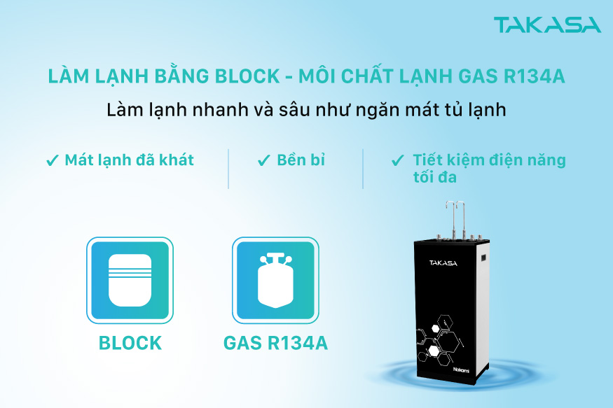 Máy lọc nước RO nóng lạnh Takasa TAW-42710H sử dụng công nghệ làm lạnh tiên tiến bậc nhất bằng Block có khả năng cung cấp nước lạnh sâu xuống đến 11 độ C. Nước lạnh như bạn làm lạnh nước bằng ngăn mát tủ lạnh để giải nhiệt ngày hè rất tiện lợi, nhanh chóng. Với công nghệ này, sản phẩm xứng đáng sử dụng ở những nơi có nhu cầu sử dụng cao như: văn phòng, trường học,..